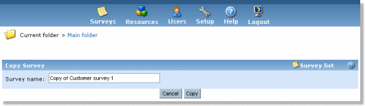 This functionality provides a way to copy a survey within a survey folder. After having clicked on the "copy"-link in the folders list, you will come to the window above. Simply type in the name of the copy, and click the button.