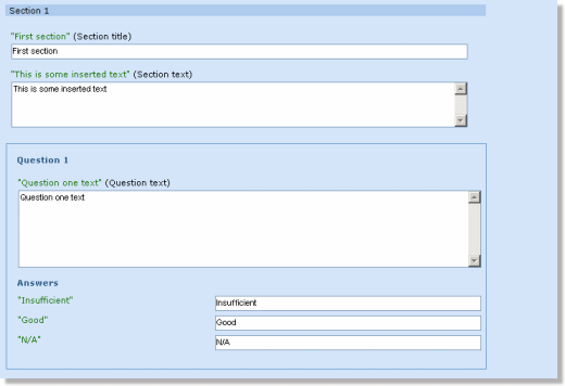 Each section is listed with all its questions. The question area lists visible text within a question, such as the question text, answer labels and validators.