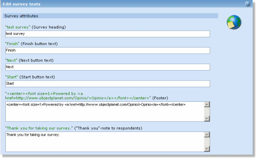 The screen lists all visible texts in the survey. Edit the fields and click save and the edited texts will replace the old texts values. This feature is meant for editing of text only, hence no fields can be left empty. Use the survey attributes screen and question editing features when setting attributes options or changing the structure of the survey.