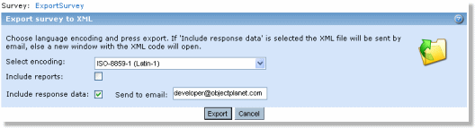 Exports the survey, including the questions in XML format. Stylesheets (CSS) and images will not be included in the export, since these are simply links to files. Choose your respective language encoding (see language encoding), select "Include reports" and "Include response data" if required and click “export”.