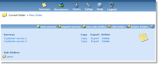 The installation will create a main folder, which may contain surveys and sub-folders. This folder is editable but can not be deleted. When navigating through folders, the current folder is always shown at the top, below the main menu.