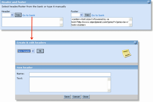 When editing header/footer in the bank, “name” is the name used to identify the header/footer for later use while “text” is what will be shown on the header/footer in the survey.