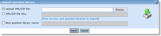 To import a question library click the “import question library” link. In the next window, select either to browse your system for the xml file (or a zip file containing the xml file) or type in the URL to where it is located.