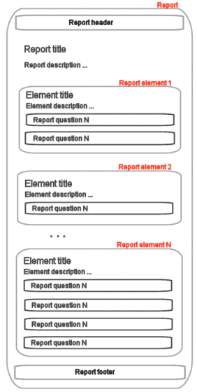 Reports are composed of one or more report elements. Each element may contain report data for one or more questions. This allows for a very flexible way to construct your report. The default summary report, for example, contains a report with one element, and includes a summary report for each question in the survey. But you can, if you wish, create a report for only one question, or a report with several different views/summaries for one single question. This is done by creating several elements, and selecting the same question for each element. Then you can vary with different chart-type for each element, for example.