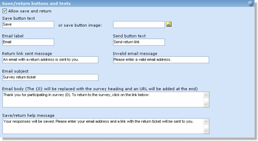 Please note that these buttons and texts will only be in use if the "Allow save and return" option is checked.