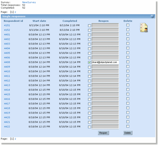 From this list there are links to each response (click on the respondent id), a column for reopening and sending the survey link to one or more recipients, and checkboxes for deleting responses. To reopen and send the survey link each respondent must have a valid email address. Some email fields have email address already set, this is because the respondent has been invited to take the survey through an email invitation. The two buttons at the bottom of the list will respectively reopen and resend, or delete the selected respondents. NOTE: To make use of the reopen/resend functionality the logged in user has to be registered with both user name and email. Also, the email language will be the logged-in user's selected language.